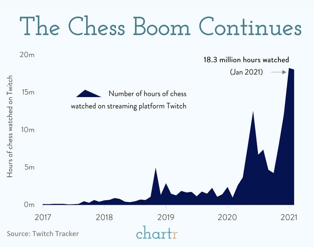 - Wspominałem o tym, że oglądam jak inni grają w szachy? Wspominałem. I że się uczę trochę też wspominałem. Lepiej mi idzie oglądanie, niż się uczenie, ale stockfisha na poziomie 4 już parę razy ograłem… ale dużo więcej razy on ograł mnie… Do grania z pierwiastkiem ludzkim jeszcze nie mam śmiałości. W każdym razie, okazuje się, że… najstarsza gra na świecie, staje się również najchętniej oglądaną grą w Internecie.